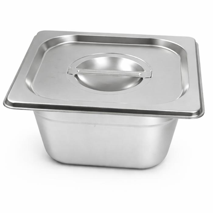 A Cuba Gastronômica GN 1/6 em Aço Inox com Tampa, profundidade 100mm (10cm) e sem alça, é a solução ideal para cozinhas profissionais, hamburguerias, açaiterias, buffets, restaurantes e lanchonetes.
